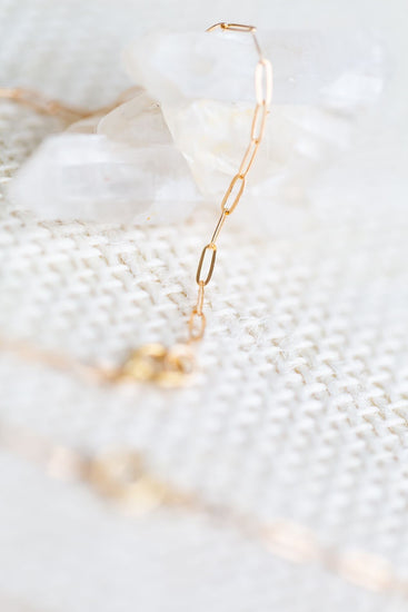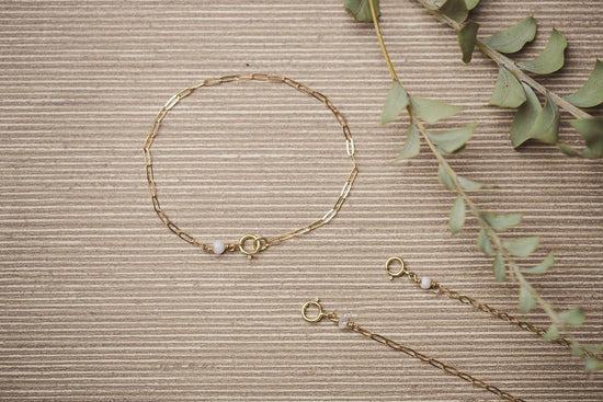 The perfect everyday bracelet with beautiful paperclip 14k gold filled chain. Choose between, plain, emerald or a pink opal bead(pictured). Made with high quality 14k gold filled chain, water safe.