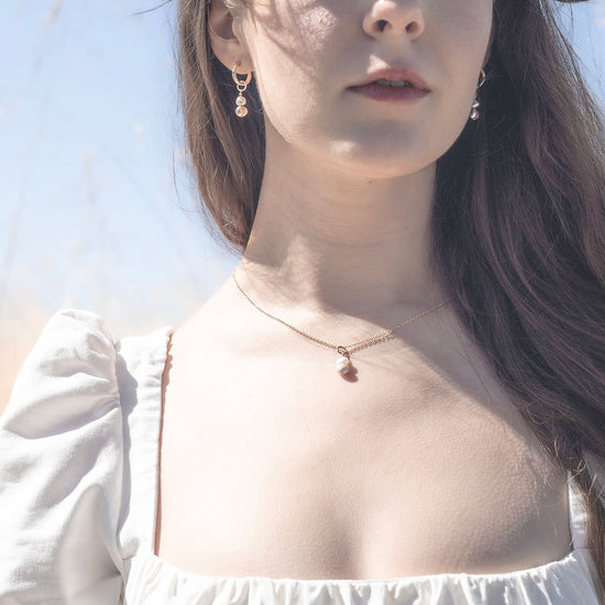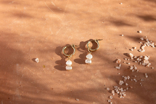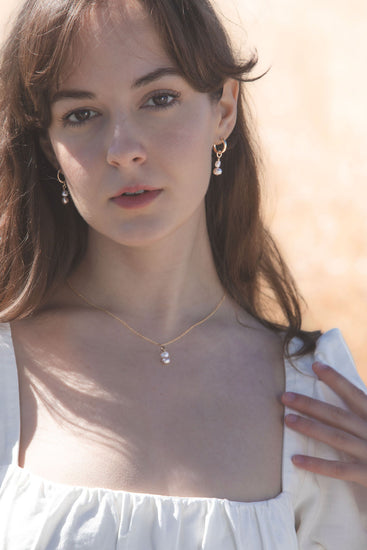 A delicately simple touch to any bride or bridesmaid. Beautiful champagne pearl + white pearl dangling on mini 14k gold filled huggies. The Marces are a versatile earring, we made them so you can remove the pearls whenever you just want to wear the huggies on their own. Matching set available too. Huggies available in 14k gold filled only. Available in bulk for savings.