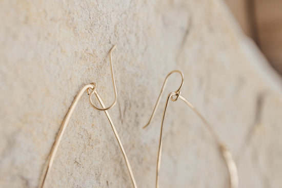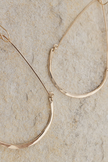 Minimalistic 100% 14k gold filled or sterling silver tear drop earrings, hand formed and hammered with a gorgeous texture. Although these are some of our biggest statement earrings, they they hold a simple & delicate look. The tear drop shape hangs perfectly on anyone, playful and beautiful. Dress the Aperelli Drops up or down for any occasion. Water safe. Earrings measure approximately 3.5" by 1 3/4". Medium to light weight.
