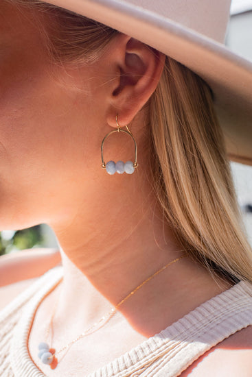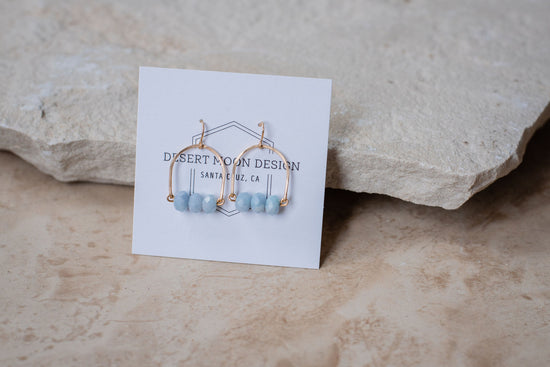 A simple and sweet earring. Handmade with aquamarine stone beads, capturing the rainbow hues in the sunlight. Lightweight dangles, great for mask wearing and a subtle addition to any outfit. All components + wire are made with 14k gold fill.