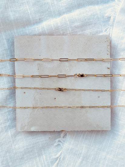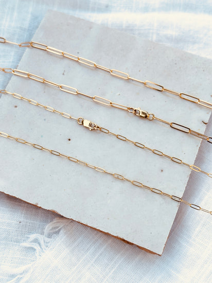 The mama to the most popular Lily Chain (shown in pic). Classic paper clip style, thick 14k gold filled chain - - - great for layering or wearing solo, with it's beautiful golden shine & hardy but still dainty size, we promise you'll want to wear the Aspen with everything. Chain thickness is 2.9mm. Non tarnish, water safe chain. Made in the USA.