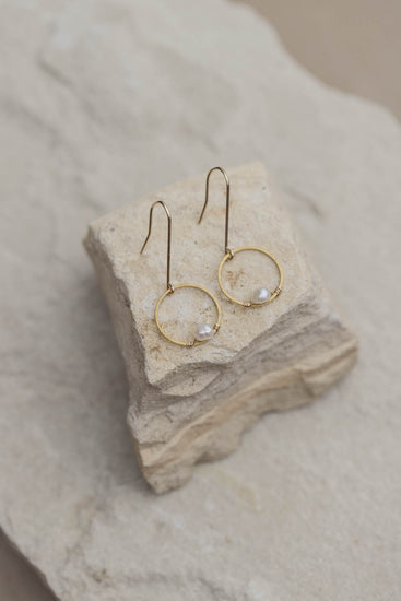 Ear wires are hand made & hammered with 14k gold filled wire. Each pearl is hand wrapped with 14k gold filled wire onto a brass ring.