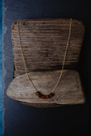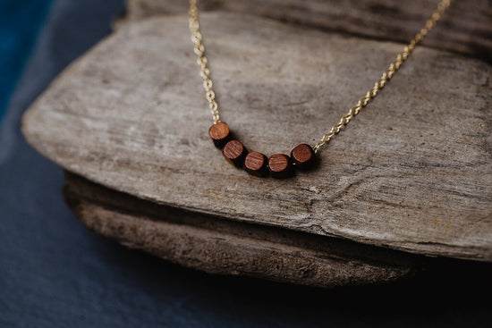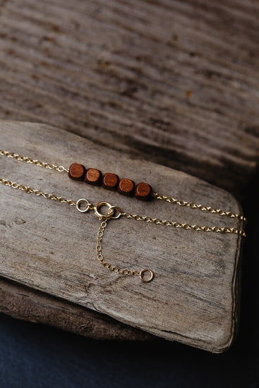 Our simple Madera Choker is a great layering necklace or just on its own. Made with real wood baby beads and 14k gold filed or sterling silver chain.
