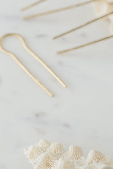 The “no kink” minimalistic hair pin for most hair types. We created this simple design in a few shapes, so anyone can have the luxury of wearing their hair up in style. Hand formed and hammered out of thick high quality brass or 14k gold filled wire. Simple, playful & easy to travel with. We recommend choosing the smaller sizes for thinner/shorter hair and the med or large size for thick/long hair. PLEASE NOTE: 14K Gold Filled hair pins are made to order & lead time is between 1-2 weeks. Brass hair pins ship out within a few days.