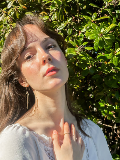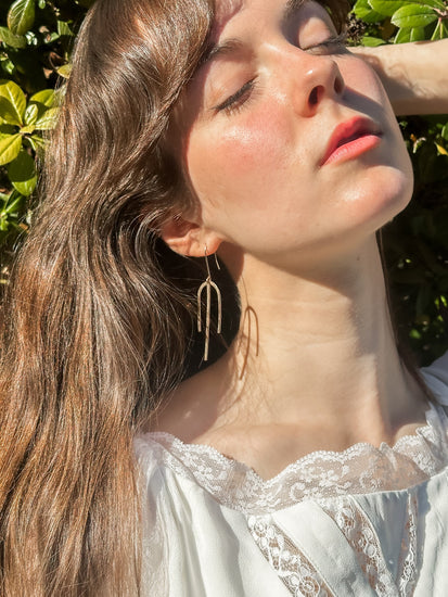 Handmade 2 part drop cactus inspired earrings in a minimalistic outline design. Hand formed and hammered in either 14k gold fill or sterling silver thick wire(14k gold filled pictured on model). Earrings measure approximately 3.5" by 1".