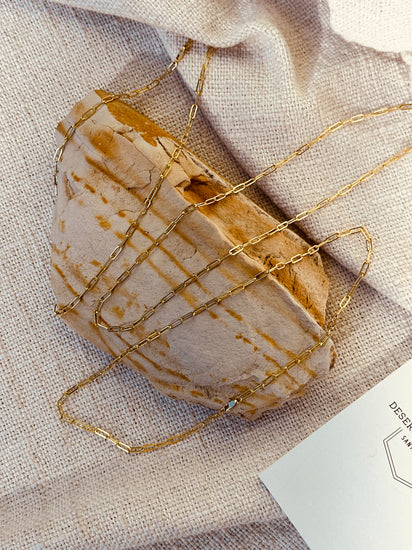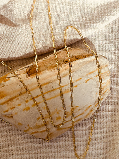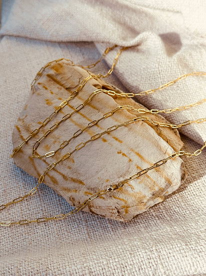 A gorgeous thick 14k gold fill paperclip chain. The Chels' yellow golden shimmer and hardiness offers an upscale luxurious look with any outfit. Wear it solo or with any of our Chains. Non tarnish and water safe. Get the complete trio -- Chels Drops & Chels Chain. Slide 2 shows the Chels Chain + Chels Bracelet. Offered in 3 lengths.
