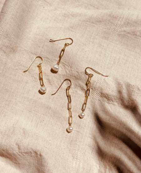 The Chels Drops are made with our new 14k gold filled thick paperclip chain with a hand wrapped fresh water pearl at the base. A simple luxurious chain dangle + pairs great with the Chels Bracelet & Chels Chain. Available in 3 or 4 link length. All ear wires are lead and nickel free + hypoallergenic.