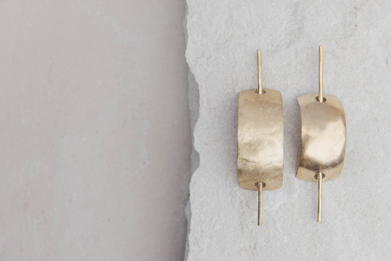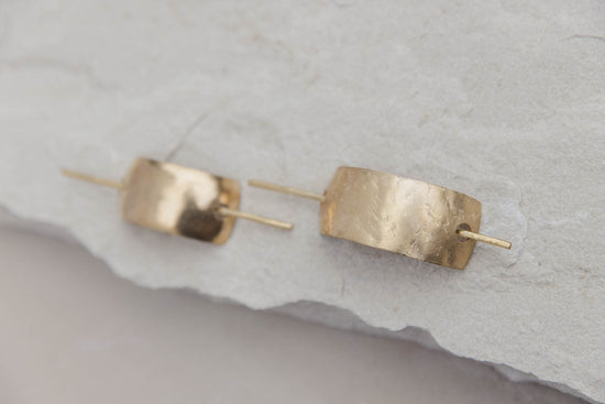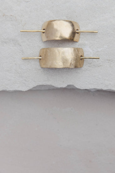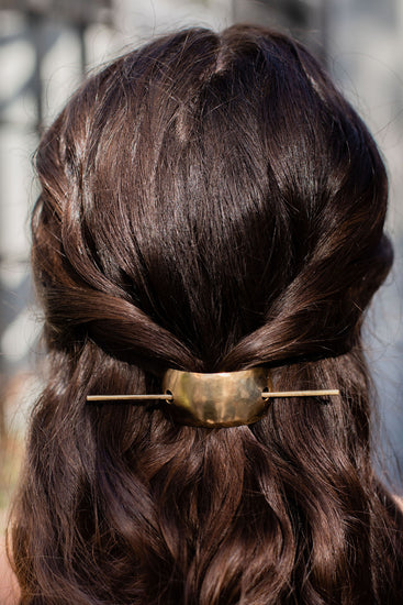 A bold minimalist hair piece for all hair types. Handmade in with solid brass & hammered in either a smooth or rustic texture. Hide your hair tie in style & lux for anyone with thinner hair. For thicker hair, you most likely won't need a hair tie, just cup all or half your hair together and slide the bar through to hold. Available in two sizes. For thinner/fine hair the small size is recommended. For thick hair, the large size is recommended. Highly durable. Please remove before bathing or swimming.