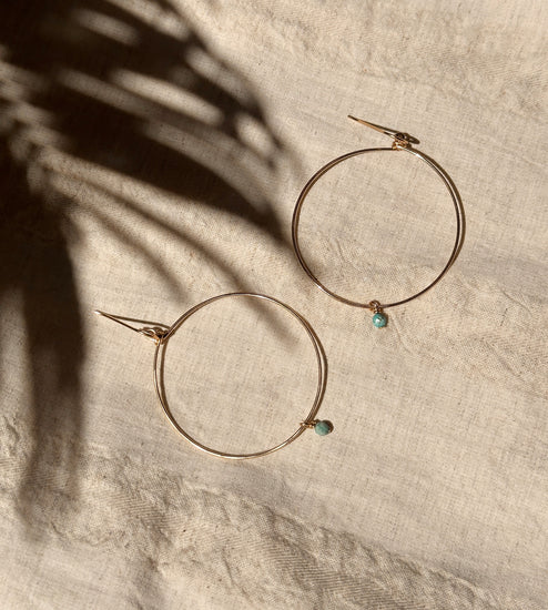 Simple everyday hammered 14k gold fill hoops with either a turquoise or emerald gemstone. All ear wires are lead and nickel free + hypoallergenic. Handmade with love in our coastal studio. Lightweight. Earrings measure 2 3/4" long by 1 3/4" wide.