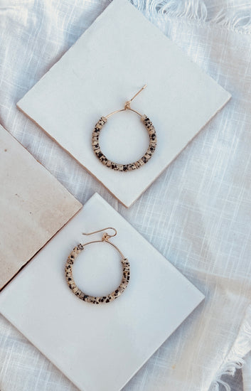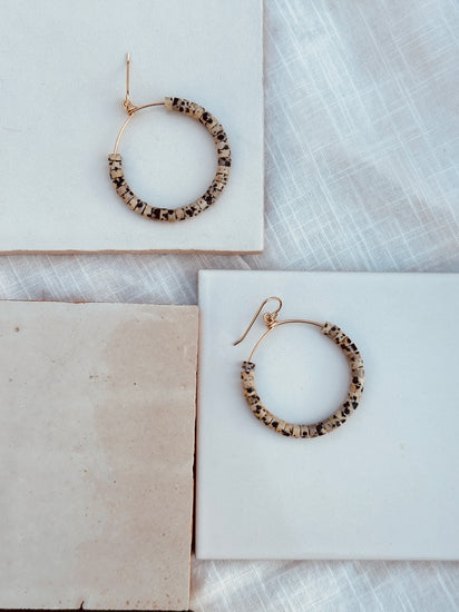 14k gold filled hammered hoops strung with dalmatian jasper stone beads. The black/cream tones are gorgeous & easy to match with any outfit. Earrings measure approximately 1.25". Ear wires made with 14k hold filled lead and nickel free + hypoallergenic.