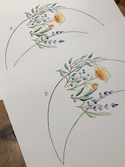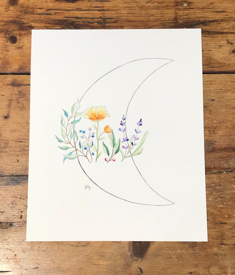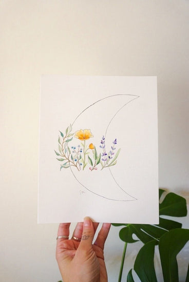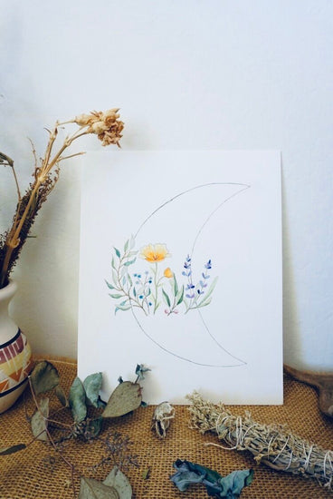 Add a little Desert Moon to your walls with our first ever local art collaboration, exclusive to Desert Moon! Originally hand drawn by our dear friend Sarah from Art ‘N Soul by Sarah, an out door educator by day, Earth inspired artist by night. The progression of this piece was originally inspired by Desert Moon Design’s oldest daughter, who’s recent wild flower embroidery project sparked joy in Ali immediately wanting to bring it to life on paper and into your hands. Art ‘N Soul did nothing but amaze us in her recreation with the embroidered wild flowers, also knowing our obsession with moons, she added in the raw moon outline to finish it off.
