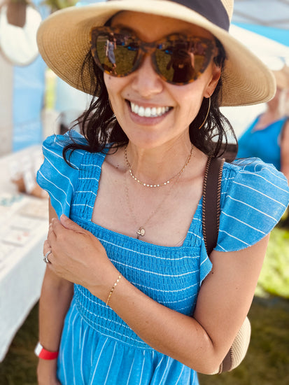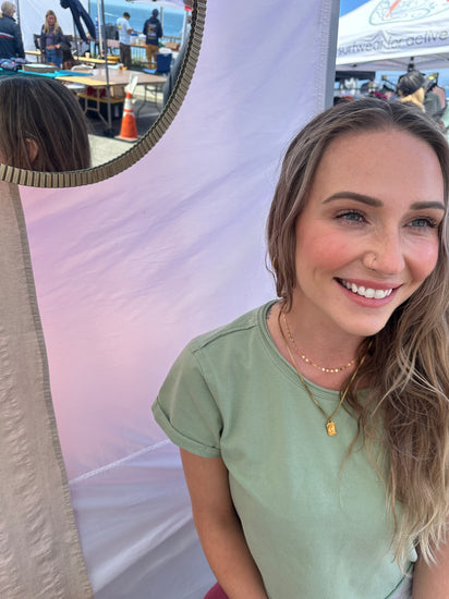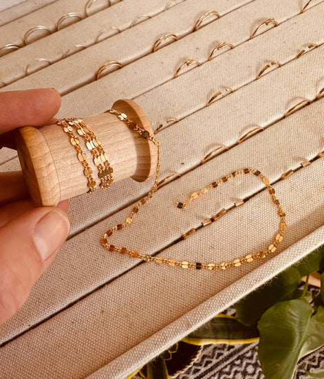 The Fem Chain is a gorgeous 14k gold filled, water safe, non-tarnish chain from our chain fitting collection. Great for the beach or mountain life, and of course for a fun night out. It's shimmery finish & detailed design is absolutely stunning, especially in the sunlight. Pair it with our adorable Mountain Studs in 14k gold fill for the complete look! Katie is wearing between a 15"-16". To pick your length, we suggest finding your fave necklace at home, lay it flat & straight, then measure it with a tape measure. When ordered online to be shipped, the Fem Chain is made with a 14k gold filled clasp for the option to take it on & off.