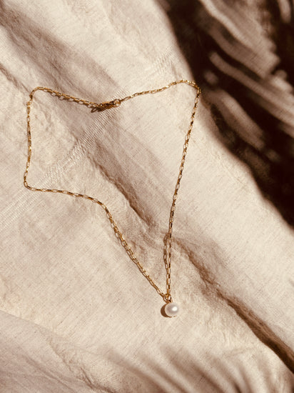 Fresh water pearl nugget hand wrapped onto a 14k gold fill flat paperclip link chain. All findings & claps are water safe + hypoallergenic. The Florence is a luxe everyday stylish piece for anyone + one of our most popular necklaces sold at events. Layers well with any chain. Made in the USA.