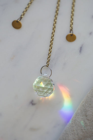The Full Moon Sun Catcher is a beautiful addition to any window or wall. It's prism crystal catches the sun rays all day long. Handmade out of solid brass + hammered with our unique moon imprint, giving a raw & realistic texture to each piece.