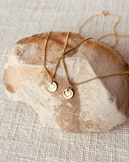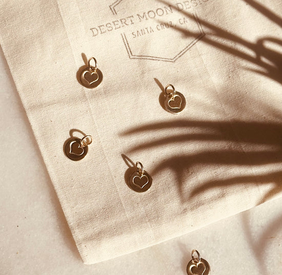 Adorable heart handmade + stamped pendant in raw brass with a 14k gold filled jump ring and the 14k gold filled Juniper Chain. Available in 16" only.