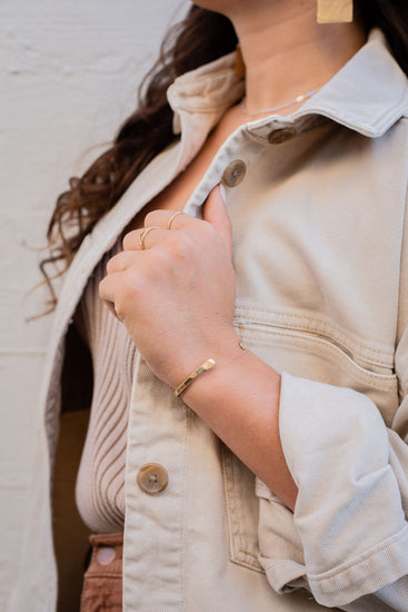 Hand hammered in perfect detail, the Henla Cuff is simple and elegant, made with high quality 14k gold fill. Stack multiple to elevate the look. If you have trouble slipping the cuff around your wrist, you may gently open up the cuff slightly to slip it on.