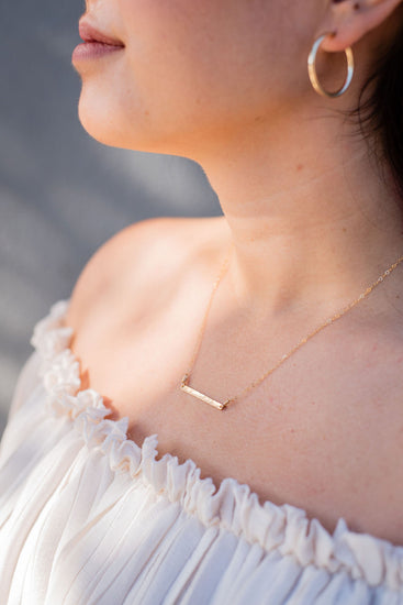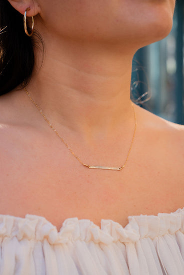 Simple hammered bar necklace. Handmade out of 14k gold fill or sterling silver. The bar is hammered lightly for a textured finish. Layer it with any of our chain necklaces. Bar measures approximately 1 1/2” by 2mm.