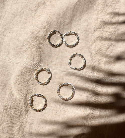 Sterling silver hoops intertwined with a 14k gold fill drip texture. A gorgeous addition to your mixed metal collection, plus perfect for both sterling silver & gold lovers. Approximately 3/4" by 3mm thick. Lead and nickel free + hypoallergenic. Water safe. Clap lever in sterling silver.