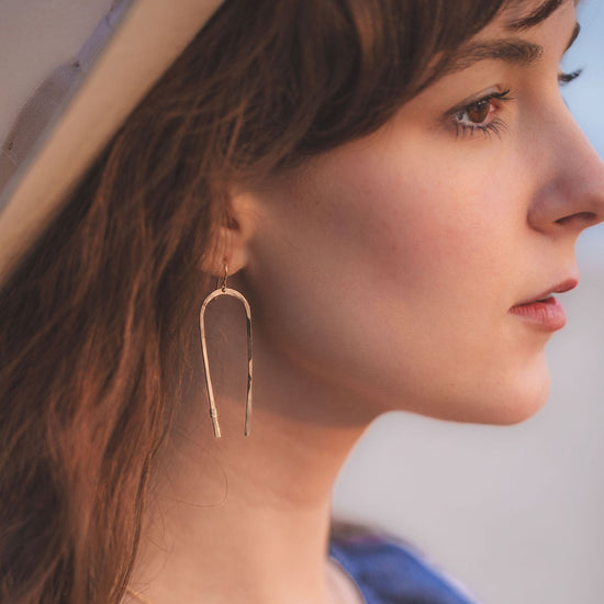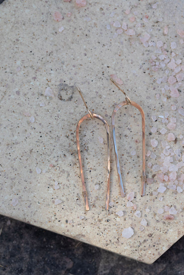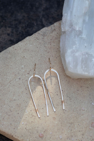 Beautiful curved elegant bar with wrapped detail. Wear the Layo Drops on any occasion. Hand formed and hammered for a perfect texture. Lightweight. Available in sterling silver or 14k gold filled. Layo Set available. Small or medium in length (large size shown in picture).