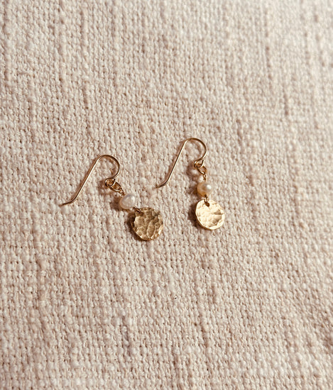 The Marcelas are handmade in 100% 14k gold fill + hammered with our classic imprint. We named these after the lovely customer who initially brought this design to life, she's been wearing them for over a year & still loving them, so we thought it was time to share them with everyone! The mini 14k gold fill discs hang on a wrapped fresh water pearl. A perfect earring for anyone looking to upgrade from studs to dangles or the minimalist at heart. All ear wires are lead & nickel free + hypoallergenic. Earrings measure 1 1/4" by 3/8".