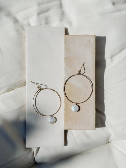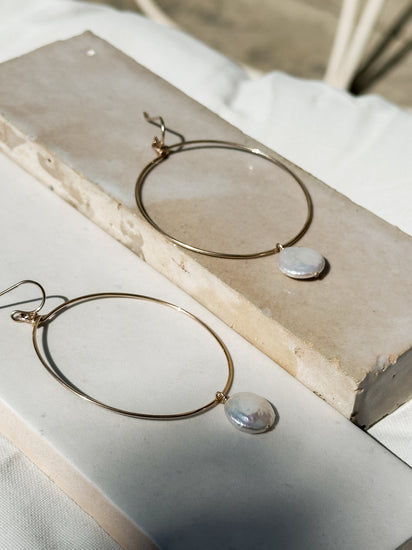 A market favorite now available to ship country wide. The Moloka'i Hoops are hand formed and hammered with 14k gold filled wire w/ a gorgeous fresh water pearl disc. Each pearl is one of a kind, showing a swirl like texture throughout, while shimmering in the sunlight at every angle. Earrings measure approximately 2" long. Lightweight, water & ocean safe. Get the matching necklace HERE .