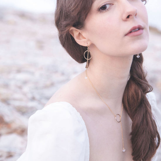 The Parma Drops are made with either 14k gold filled or sterling silver rings & rope chain, with a beautiful herkimer diamond dangling at the end. The Parmas are gorgeous yet minimal for any wedding dress or year round attire. The matching Parma Necklace is also available or as a set.
