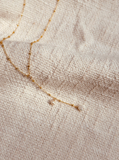 Named after a beautiful bride who first wore & helped design the Grace for her wedding. Gorgeous fresh water pearl drop necklace with ball detailed 14k gold fill chain. Sweet & whimsical with any outfit, bridal dress or date night. Pairs great with any of our pearl earrings. Necklace length is as listed + drop chain with pearls is 2" long.