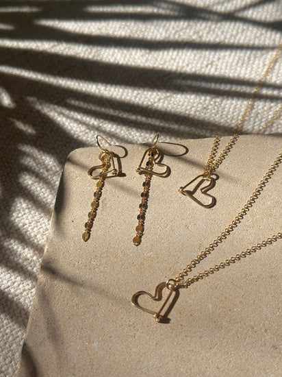 Heart wrapped drop earrings with the Fem Chain to dangle. Sweet & whimsical, the Poet Dangles are a symbol of love in all it's forms. Lightweight, 100% 14k gold fill, non-tarnish. Hearts measure approximately 3/4" earrings measure 2" in length. Made with lead & nickel free + hypoallergenic ear wires. Made in the USA.