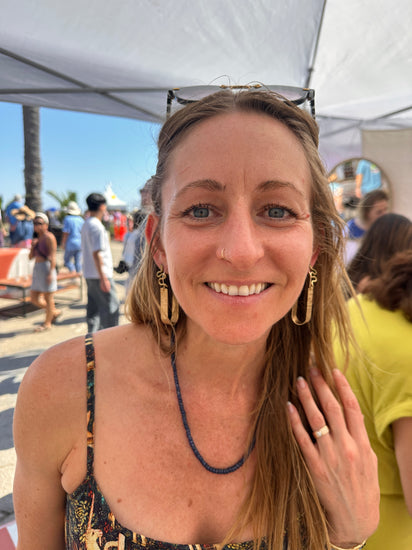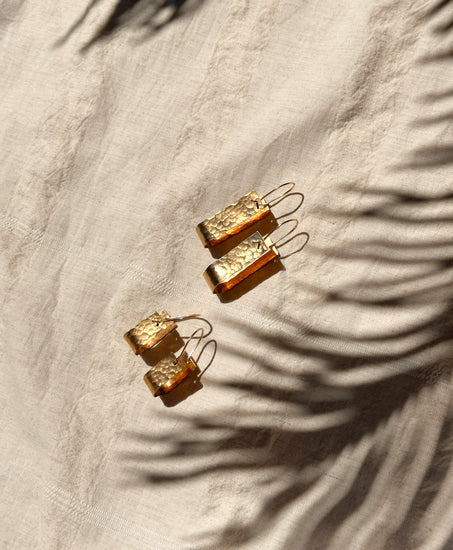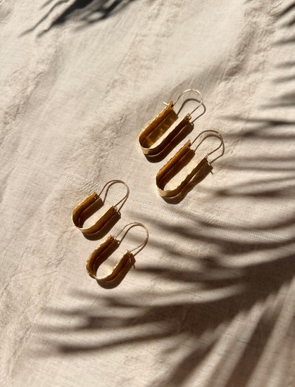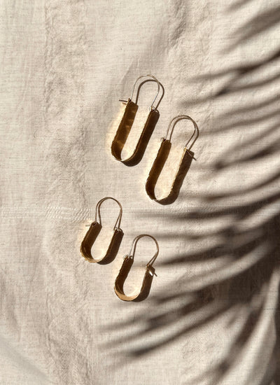 Handmade and hammered in an oblong swoop shape hoop dangle style. Each Ray Sierra are one of our OG designs from 6 years ago we decided to bring back! They're made with raw brass and hung on a handmade lightly hammered 14k gold fill ear wire. Lead and nickel free + hypoallergenic. We offer two sizes in the Ray Sierras, (model is wearing the large size).