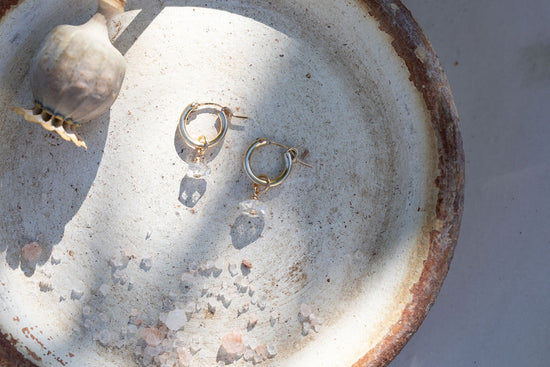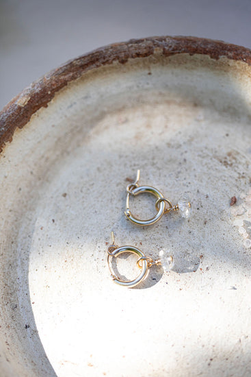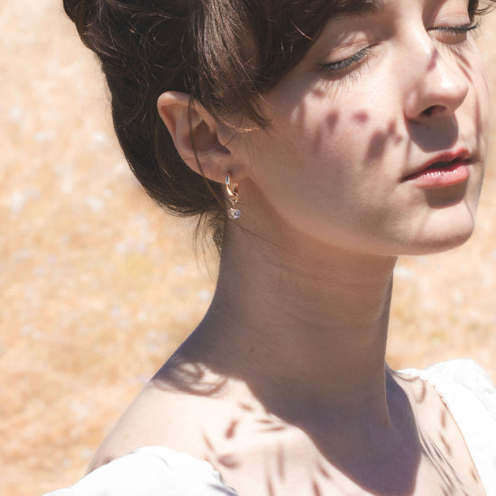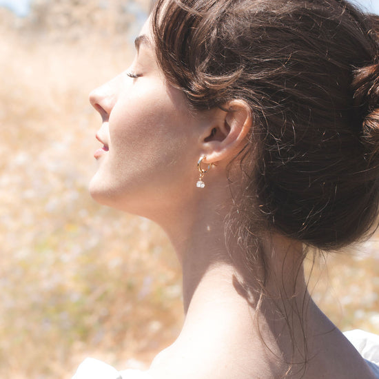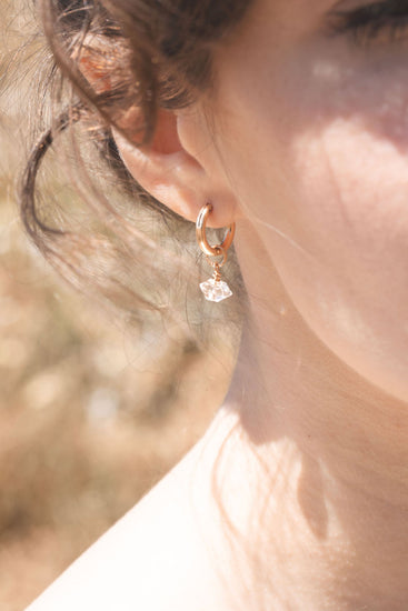 Elegant & stunning in every way, the Roma Huggies are the perfect wedding accessory for both bride or bridesmaid. Each Roma comes with a mini 14k gold filled huggie + a gorgeous herkimer diamond that we made to be removable if you want to wear the huggies alone after the celebrations.
