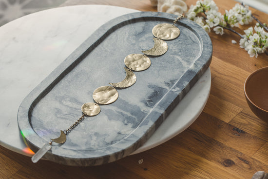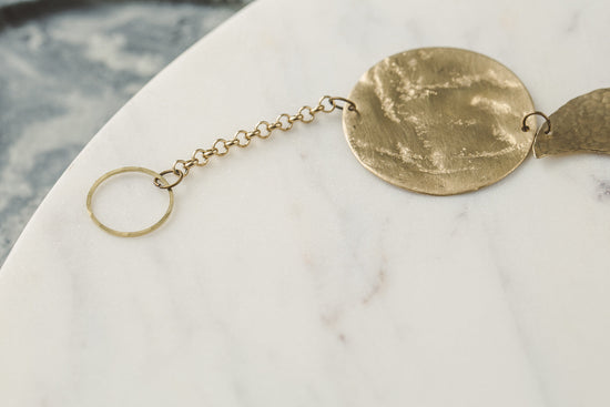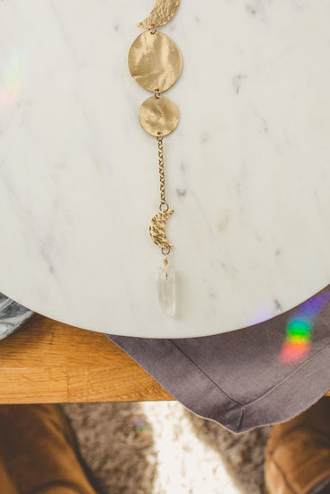Add a touch of beauty to any wall with the Sadie Wall Hanging. We added a little surprise at the bottom for all the quartz crystal lovers. Handmade brass moons, hammered to perfection, attached to brass chain links. Create a fresh new look in any room or give the Sadie as a gift. Quartz crystal stones may vary in size. Wall hanging measures approximately 18” by 1 3/4”. Option to add a prism crystal at the end in place of quartz crystal.