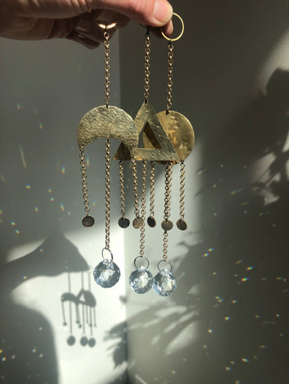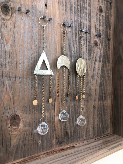 Stella Sun Catchers are stylish addition in any home. Hang it in your favorite window & watch it catch beautiful sun rays all day long. Hand cut, sawed and hammered out of solid brass & hung on hardy brass chain. Triangle Stella is hammered with an astrology inspired design. Full Moon Stella is hammered with our exclusive rustic imprint for a unique moon inspired look. Crescent Stella is hammered with our classic sophisticated texture. Choose between a 9" (shown in pic) or 12".