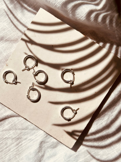 Mini Ferra Huggies in sterling silver, for all our silver lovers. These adorable sterling silver hoops are 2.3mm thick, making them lightweight and easy to wear. They have a hinged post that clicks securely with easy-to-use closure. Hoop earrings loop the ear from front to back and offer a wide variety of design options—they look great as-is or are ideal for attaching drop and dangle designs. Hoops measure in their entirety 1/2", made in the USA.