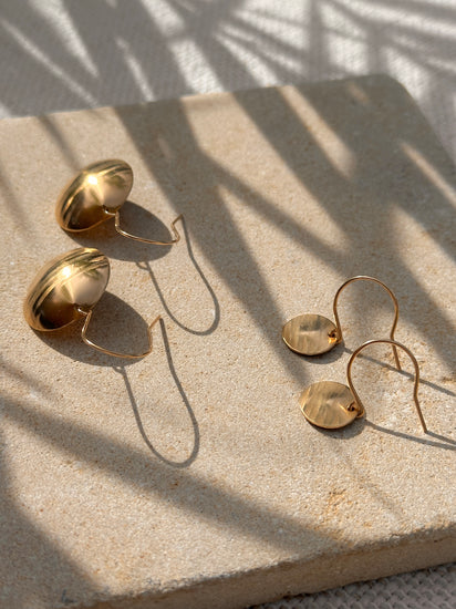 These minimalist dangles celebrate coastal beauty with a hammered circular design that echoes ocean sunsets. The textured surface captures light like rippling water meeting the horizon, creating subtle dimension with every movement. Available in solid brass, sterling silver, or 14k gold fill, they're engineered for comfort with their featherweight construction. An understated choice for those who appreciate nature-inspired jewelry