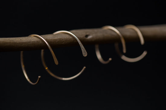 Minimalistic every day hoops handmade out of 14k gold filled or sterling silver wire. Lightly hammered throughout with a flat detail at the end. Available in either 14k gold fill or sterling silver. Comes with silicon backings.