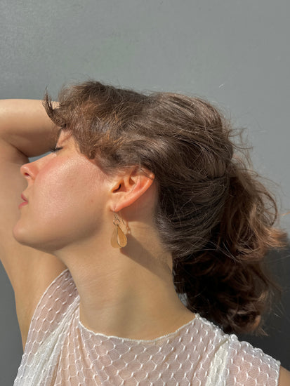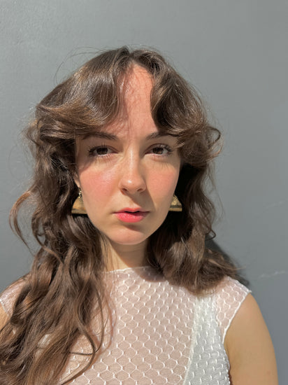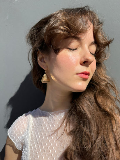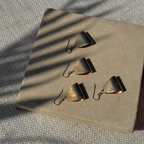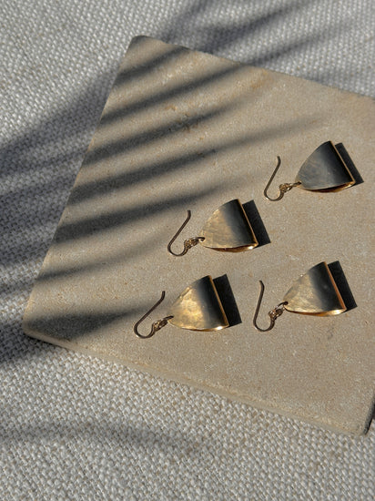 These striking brass dangles marry geometric precision with nostalgic flair. Hand-folded brass creates substantial presence without weight, while the 80s postmodern aesthetic delivers bold visual impact. The versatile silhouette transitions effortlessly from statement piece to everyday accent. Handmade, formed and hammered brass with 14k gold fill components including the ear wires, which are lead & nickel free + hypoallergenic
