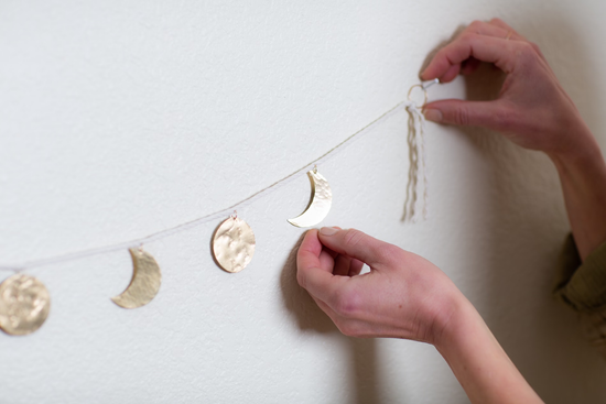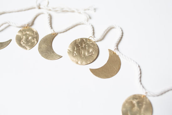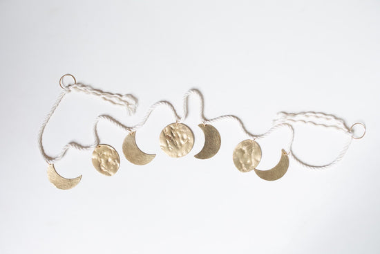 The Volana Wall Hanging is a beautiful moon-phase piece of art for any room. Add it to your gallery wall or let it stand out on it's own. Each moon is created by hand out of solid brass. The full moons are hammered with a rustic moon imprint & the crescents are hammered with the classic imprint. Choose between the moon-phase hanging on a cream cotton cord or brass chain links. Measures approximately 27” in length & moons measure 1 3/4”.