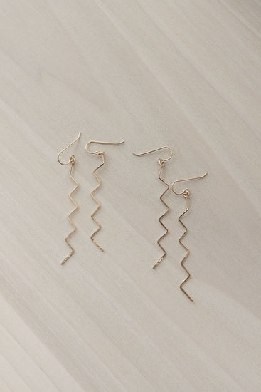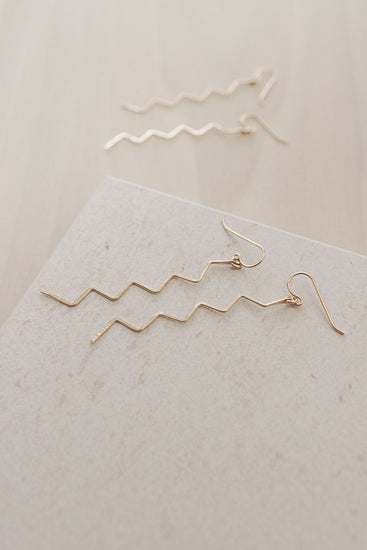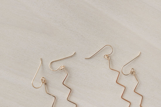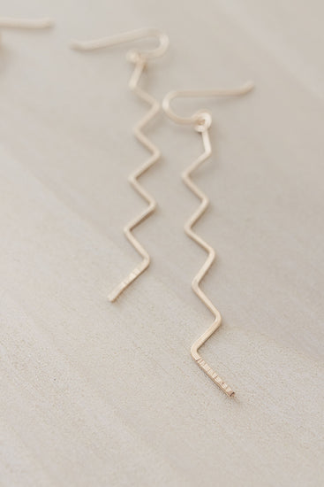 Add a fun & minimalistic pop to your ears with the Zag Ziggies. Hand formed and hammered in detail with your choice of sterling silver or 14k gold filled. Classic, sturdy and sure to be a delicate statement earring. Earrings measure approximately 2 3/4" by 1/4". (14k gold filled shown in picture) Zag Ziggie necklace also available HERE.